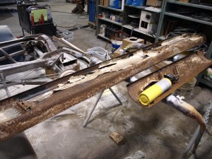Now that the frame is media blasted Alex is repairing any damaged areas on the frame before primer.