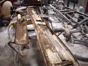 Jared is pulling apart the running boards for the 1949 Chevy to get it ready for media blasting.