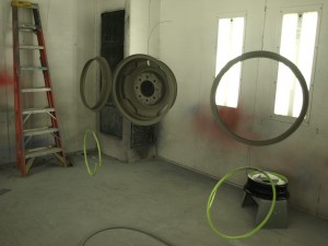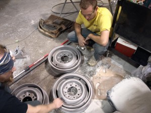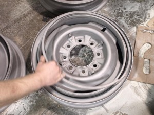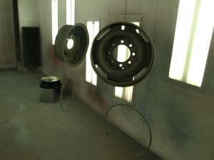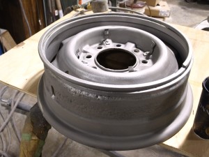 The wheels for the Chevy have been repaired and are in the paint booth getting primed. While that is being done Jared is working on the repairs to the front grille which is now blasted.