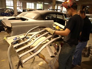 The team here at Precision Restorations is rallying to get the Chevy 3800 ready for SEMA. Chris and Mike are working on the chassis, the bed, the cab and the center console and Tobin is working on getting the fenders worked out. We also have Hayden working on getting the Mercedes seats for the truck recovered.