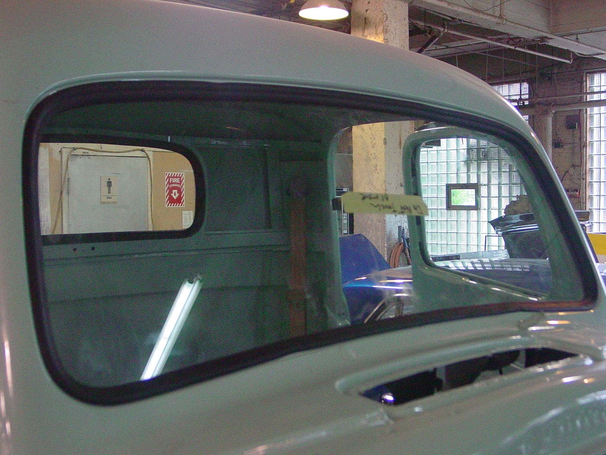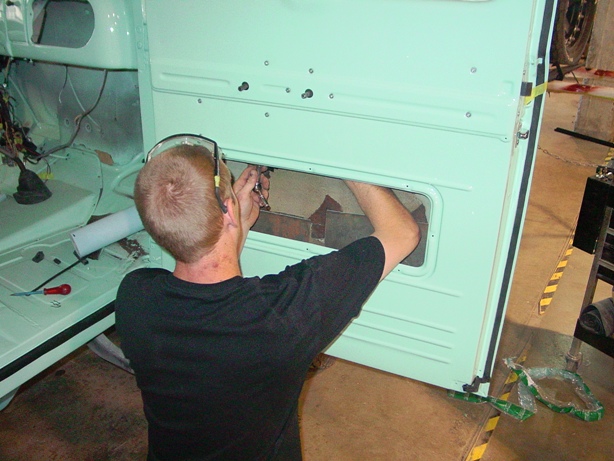 Alex is getting the window, latches, handles and trim installed on the 1950 Ford.