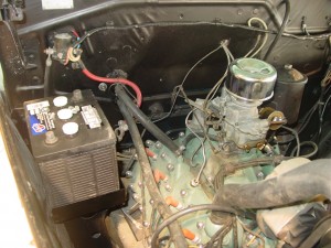 The new carburetor and battery tray are installed in the Ford.