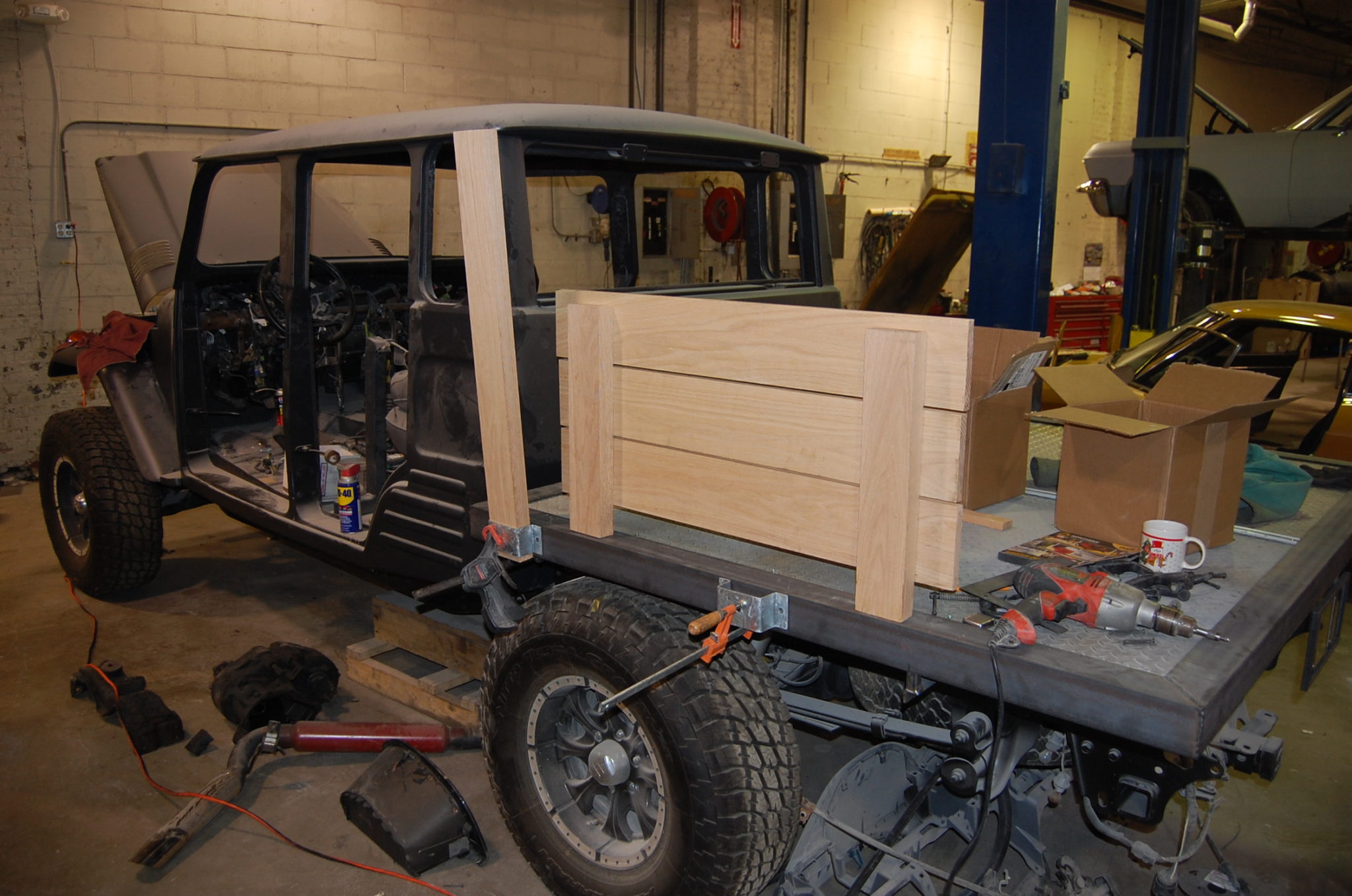 Alex is hanging the doors and working on the wood bed for the Toyota today.