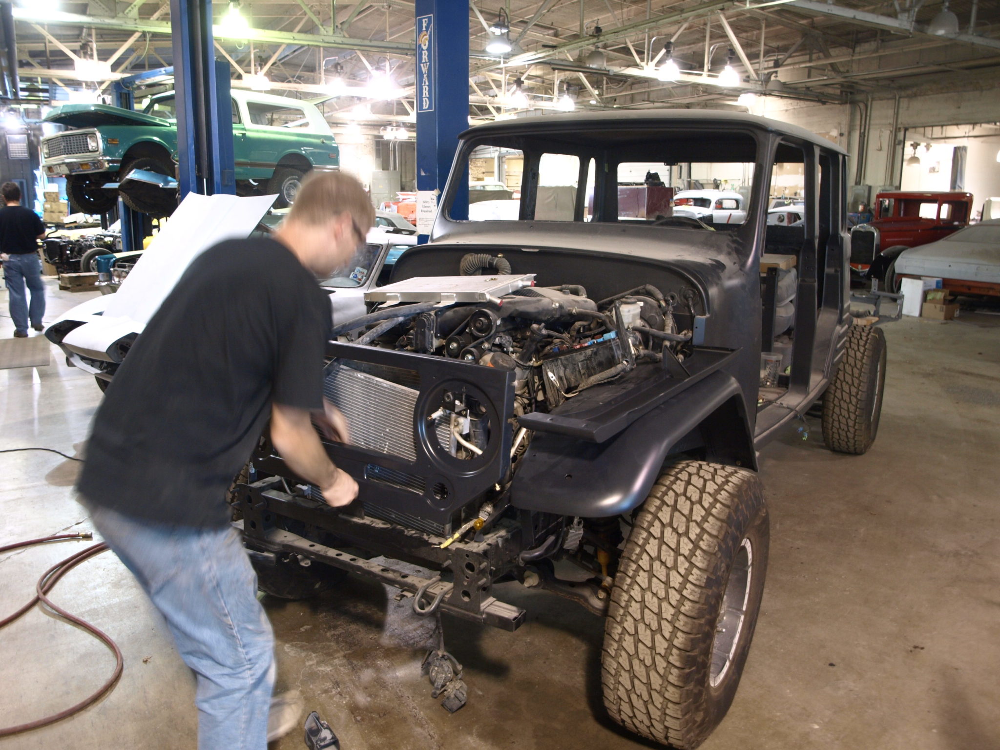 Alex is grinding down a few spots to repair on the inside of the cab for the 1967 Toyota Landcruiser.