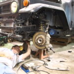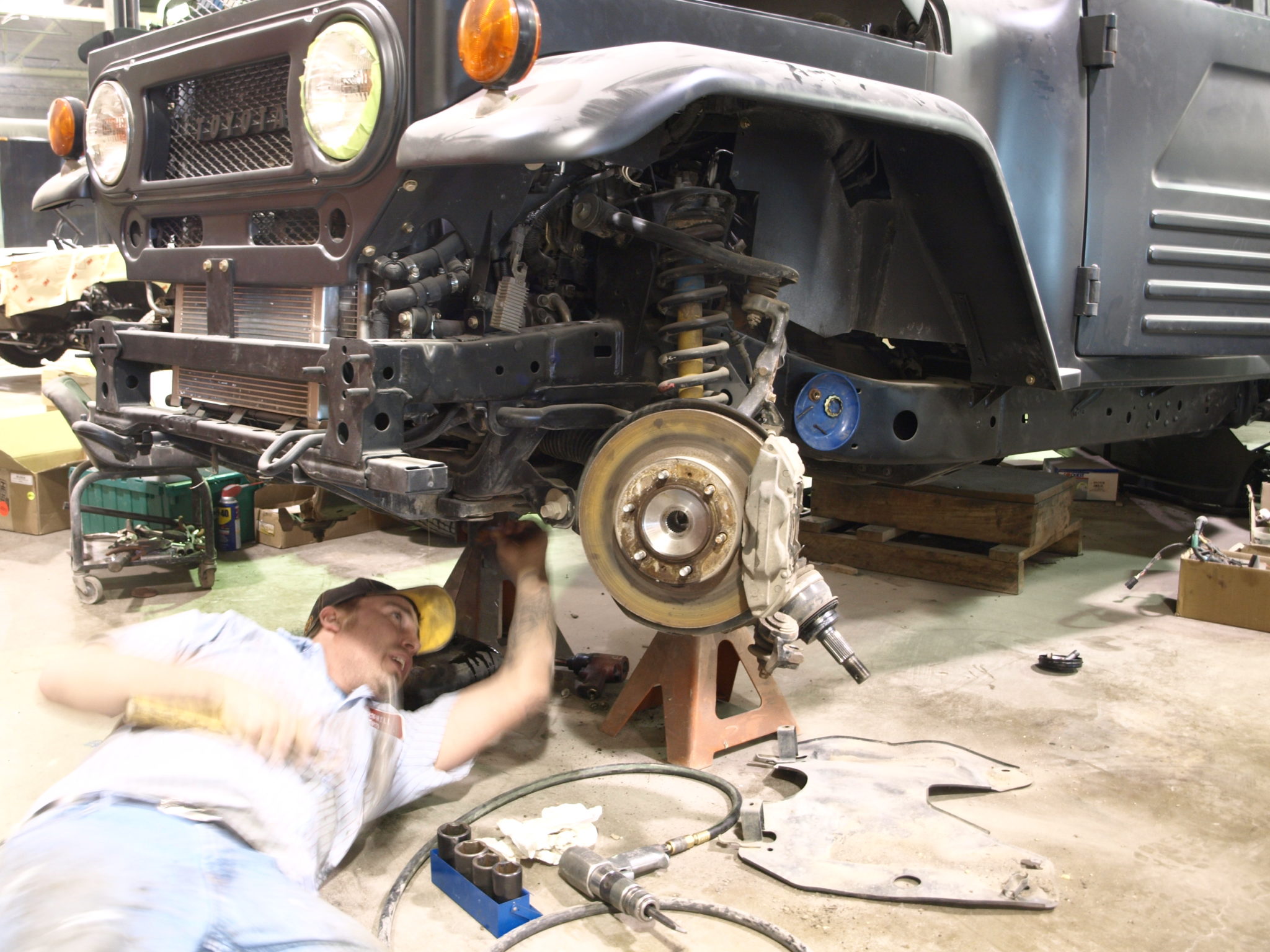 John is working on replacing the front axles for the chassis of the Toyota.