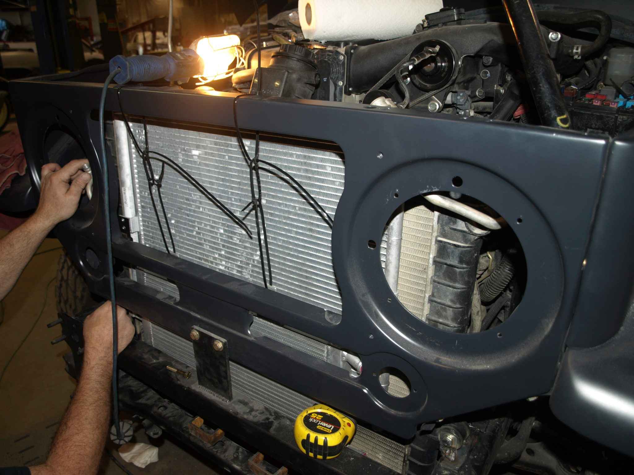 Building brackets and installing for the fuse block, radiator and a/c components.