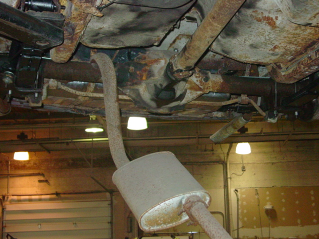 Dan is removing the rusted studs from the exhaust today in fabricating the new dual exhaust.  This exhaust will be custom fabricated with 3″ pipe and flowmaster 40 series mufflers.