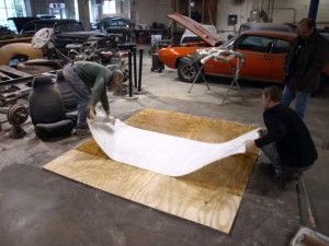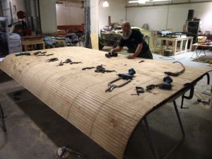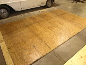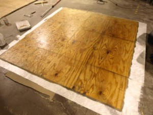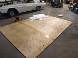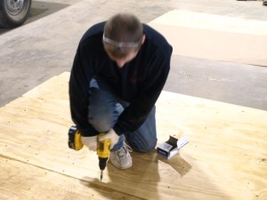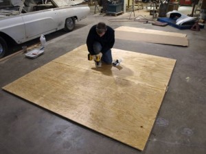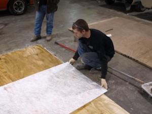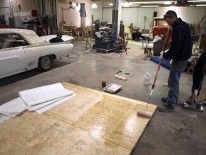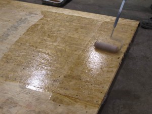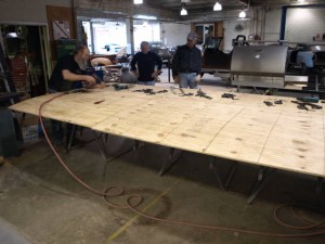 Alex is finishing up with the second panel for the tailgate trailer. The grid lines are for laying out the fiberglass.