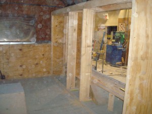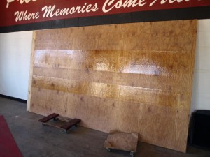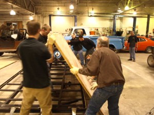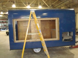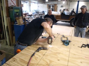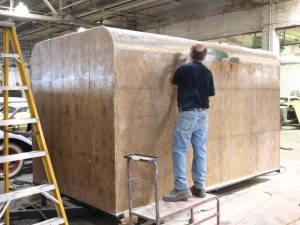 Larry is fabricating the roof for the custom fiberglass tailgate trailers. He is attaching the wood to steel beams underneath, then he will fill the cracks with body filler and then we will apply the fiberglass over that.