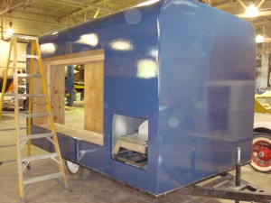 Dan laid a blue paint out on the custom trailer. This is not the color that they are going with, he is actually using this paint for a guide coat on the trailer. Meaning he is now able to see any high or low spots on the body of the trailer and repair them before the final paint coats get applied. The actual color of the trailer will be black.