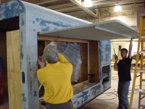 Alex and mike are installing the next layer of fiberglass and resin for the Tailgate trailers front panel.