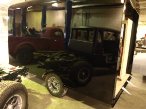 The trailer is in the booth getting masked off for paint. Also the new chrome wheels are in.